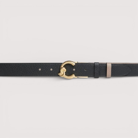 Opasek řady C-ME zdobí logo reinterpretované prostřednictvím písmene C Coccinelle, které se spojuje a objímá bubínek, ikonický prvek značky. Jeho charakteristickým rysem je oboustranná dvoubarevná osička, ideální pro kombinaci s jakýmkoli vzhledem.