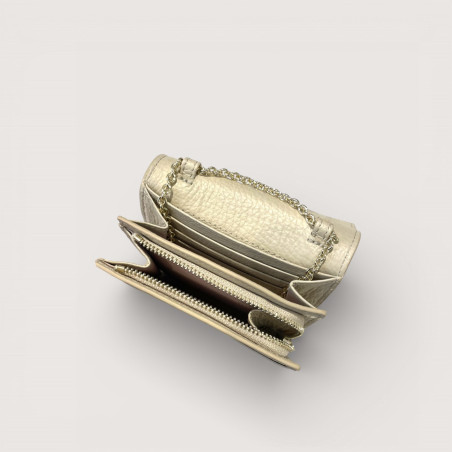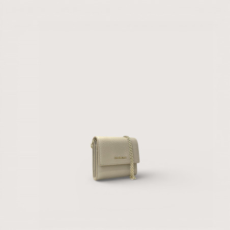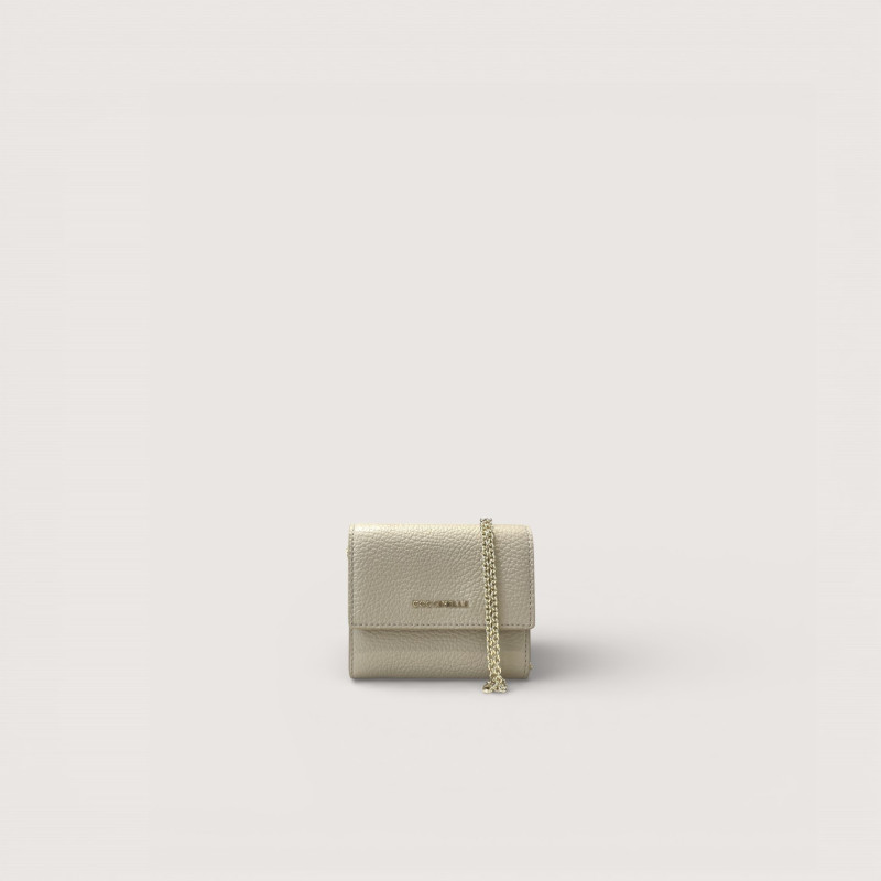 Kožená peněženka Coccinelle s řetízkem pro nošení přes tělo. Uvnitř je zip na mince i přihrádky na karty.