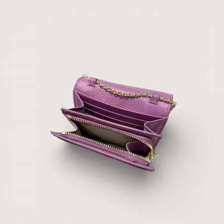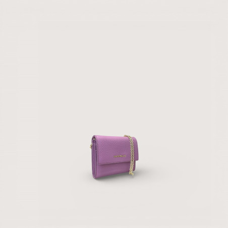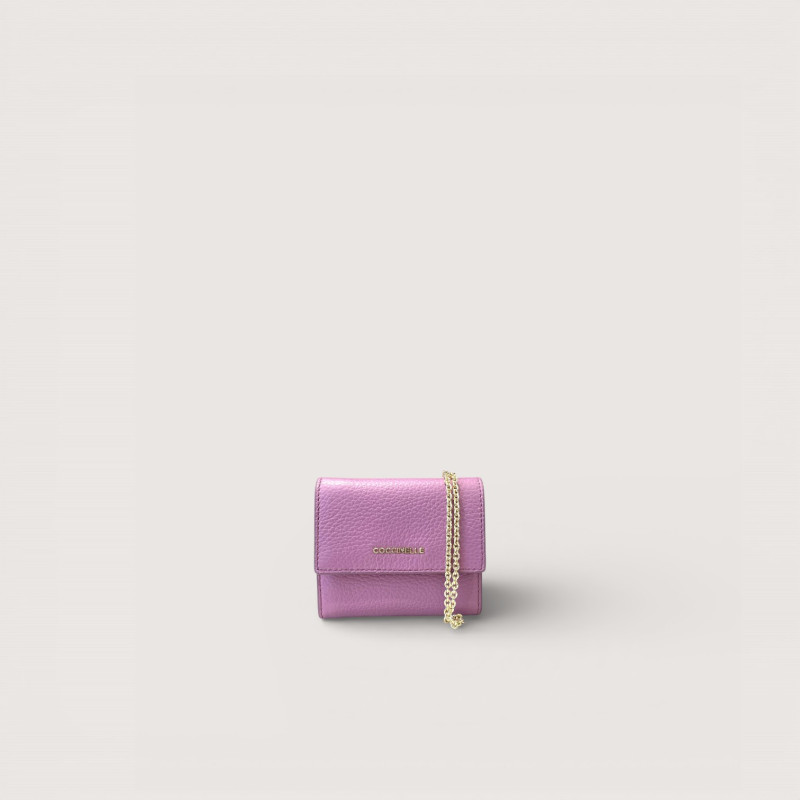 Kožená peněženka Coccinelle s řetízkem pro nošení přes tělo. Uvnitř je zip na mince i přihrádky na karty.