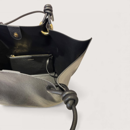 Kůže a kov spolu dokonale ladí a vytvářejí odvážný, ale sofistikovaný design; měkká trubková ucha, zdobená elegantním kruhovým kovovým detailem, se jemně proplétá panely a vytváří dva hluboké záhyby. Výsledkem je ženská, pevná a odvážná silueta. Všechny modely jsou vybaveny odnímatelnou vnitřní kapsou, kterou lze