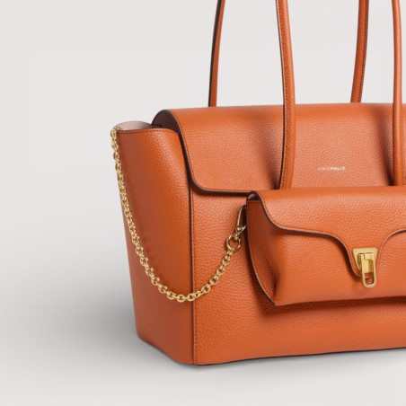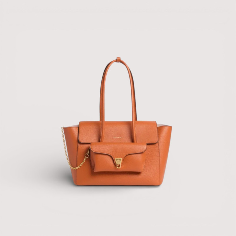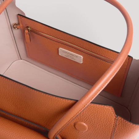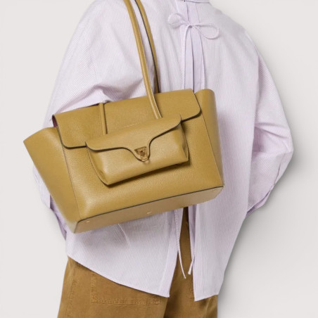 Coccinelle Double Beat je opravdovým každodenním společníkem, prostornou taškou s klopou, vybavenou praktickými trubkovými uchy, aby se dala pohodlně nosit na rameni. Díky inovativnímu řešení je přední kapsa odnímatelná a v případě potřeby se promění v praktickou taštičku nebo elegantní psaníčko, které se hodí pro nejvýznamnější příležitosti. Kapsy jsou také symbolem identity Coccinelle díky ikonickému detailu v podobě trsátka.